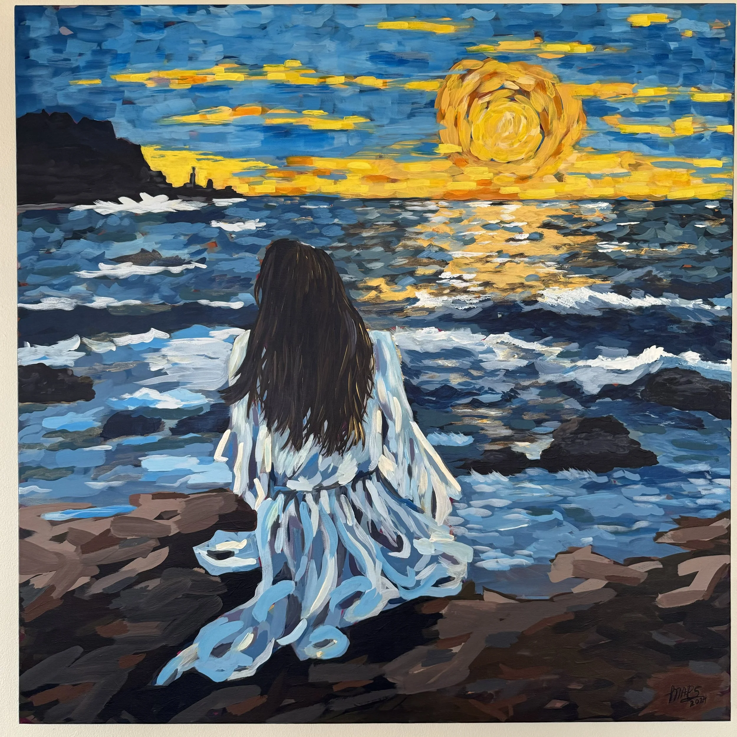 One of my pieces, Renacer (“Rebirth”), depicts a woman looking at the sunset, symbolizing the opportunity to reflect on the day and embrace the chance to try again tomorrow. It’s a piece about introspection and renewal—concepts that resonate strongly with the themes I explore in my work.